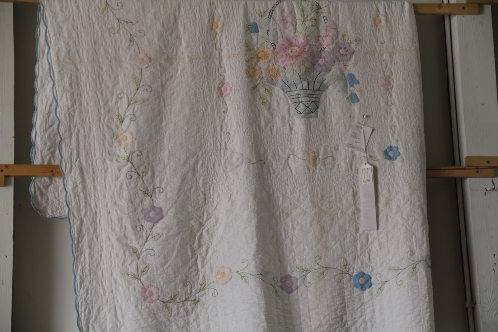 This quilt is hand embroidered and we don't know much history about it. What we do know is we saved it from a man at the flea market that had no clue about quilts. He was going to bleach it to get rid of the stains. This quilt won 3rd place